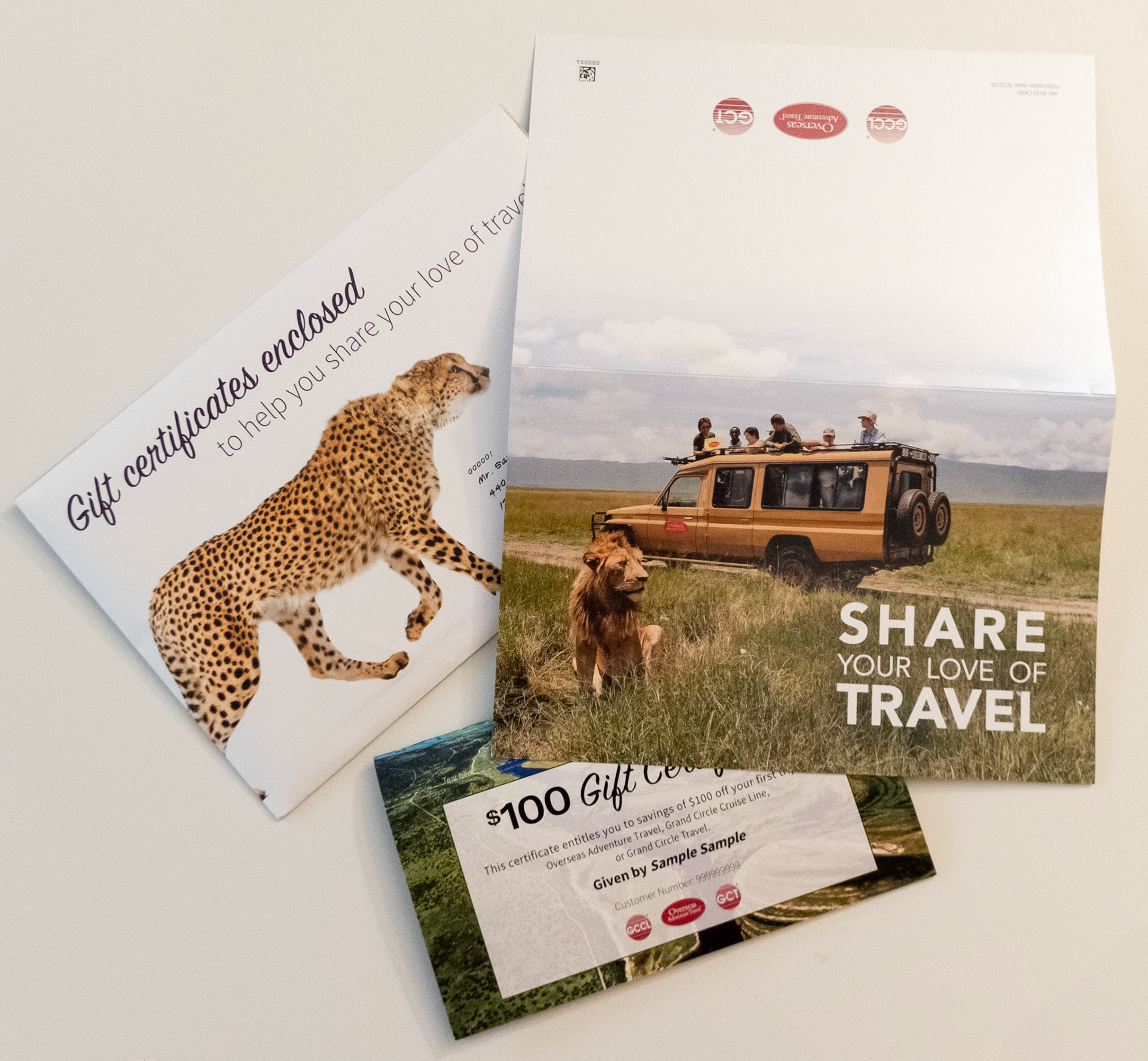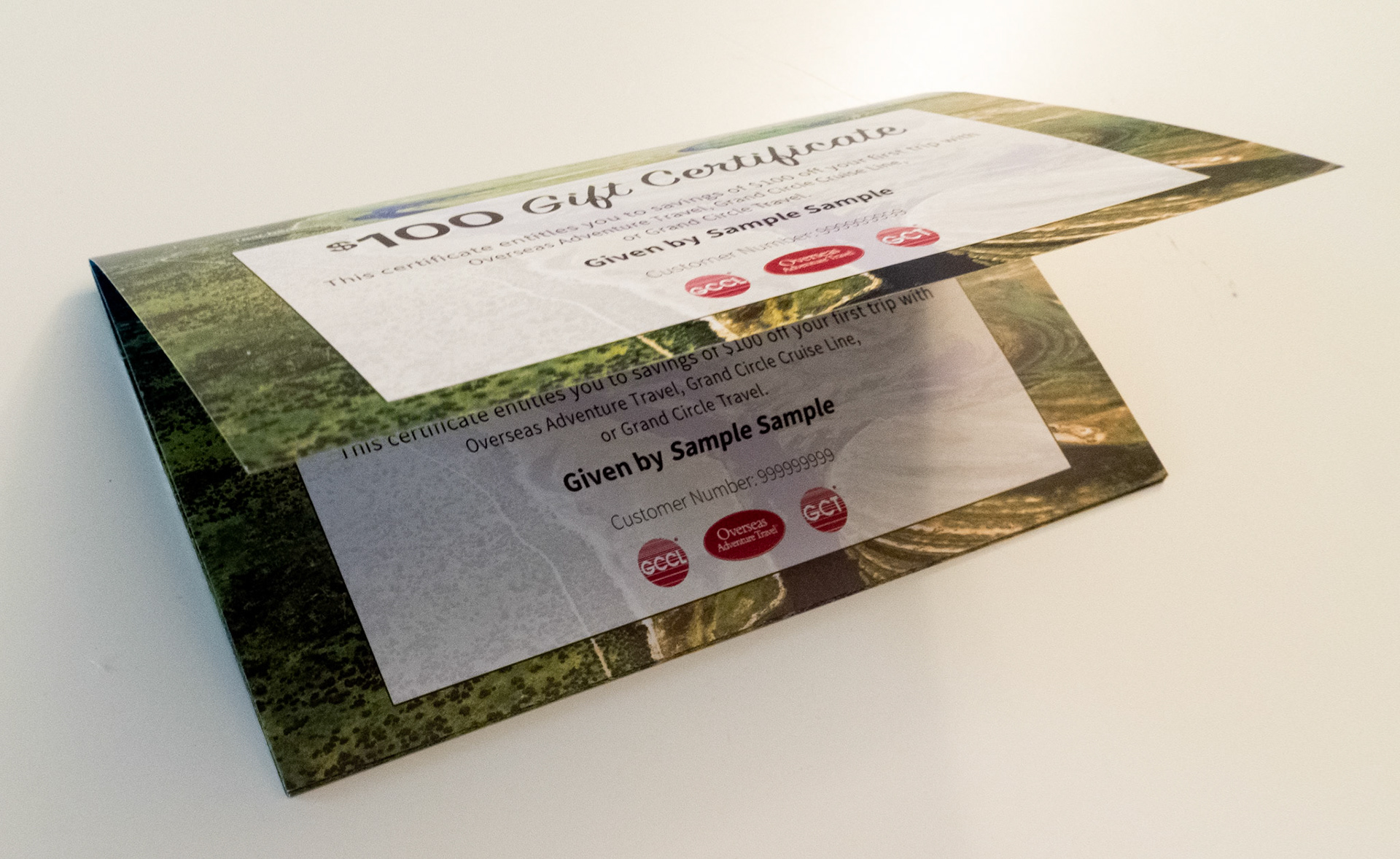 This is a letter package designed for O.A.T.'s loyalty program. This package includes a set of saddle stitched gift certificates, a letter, and envelope. Working with the O.A.T. photo department.