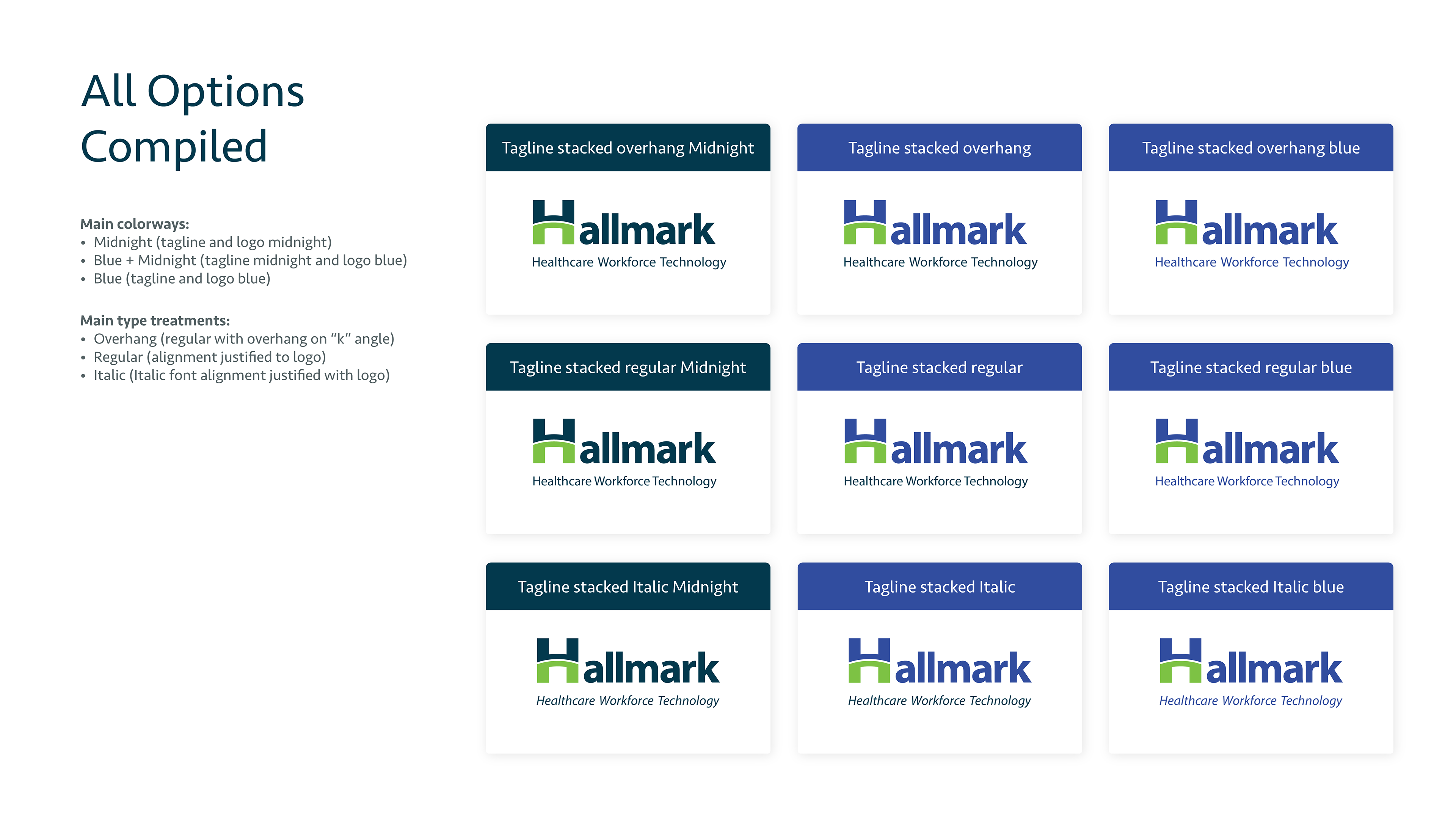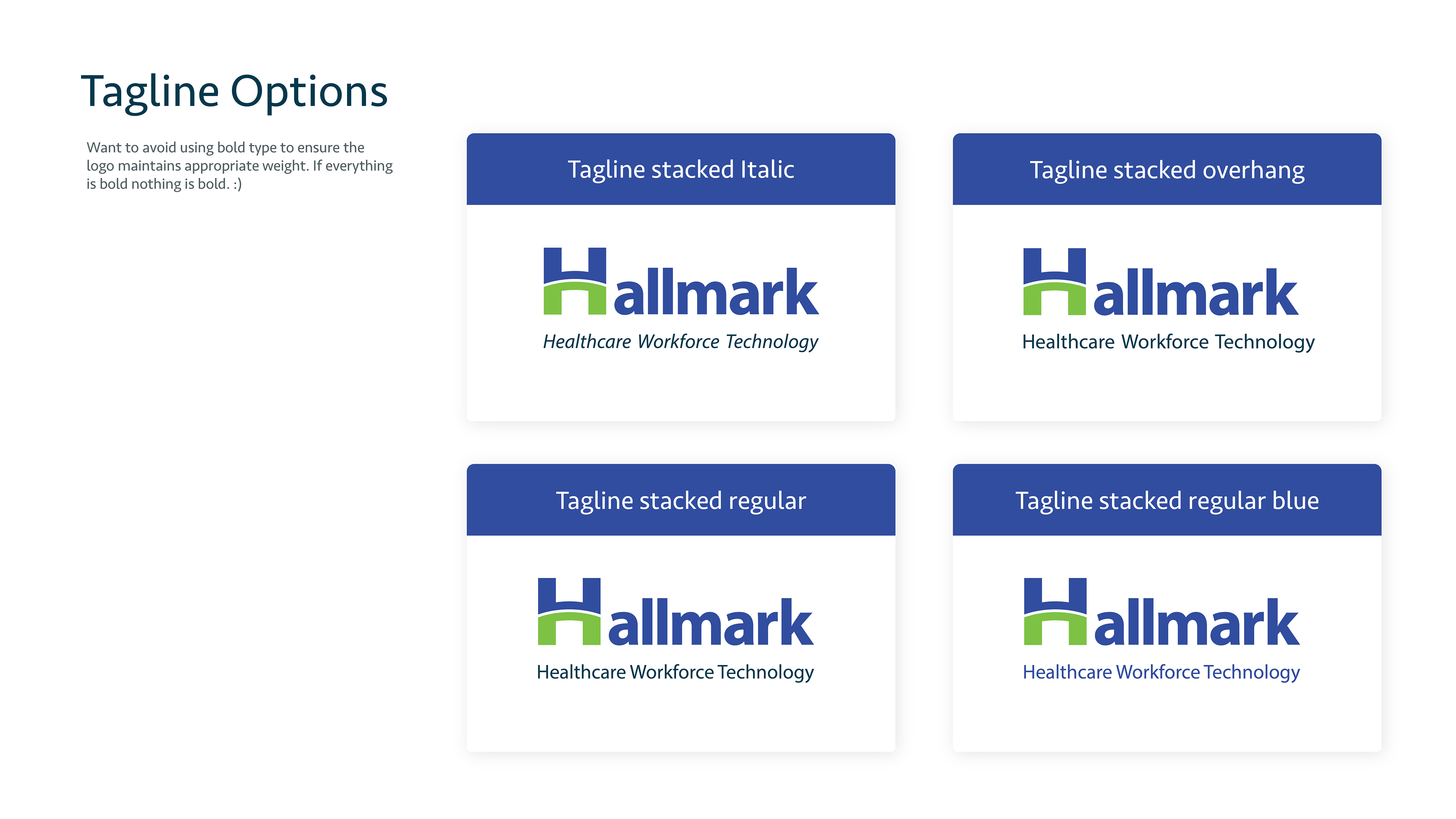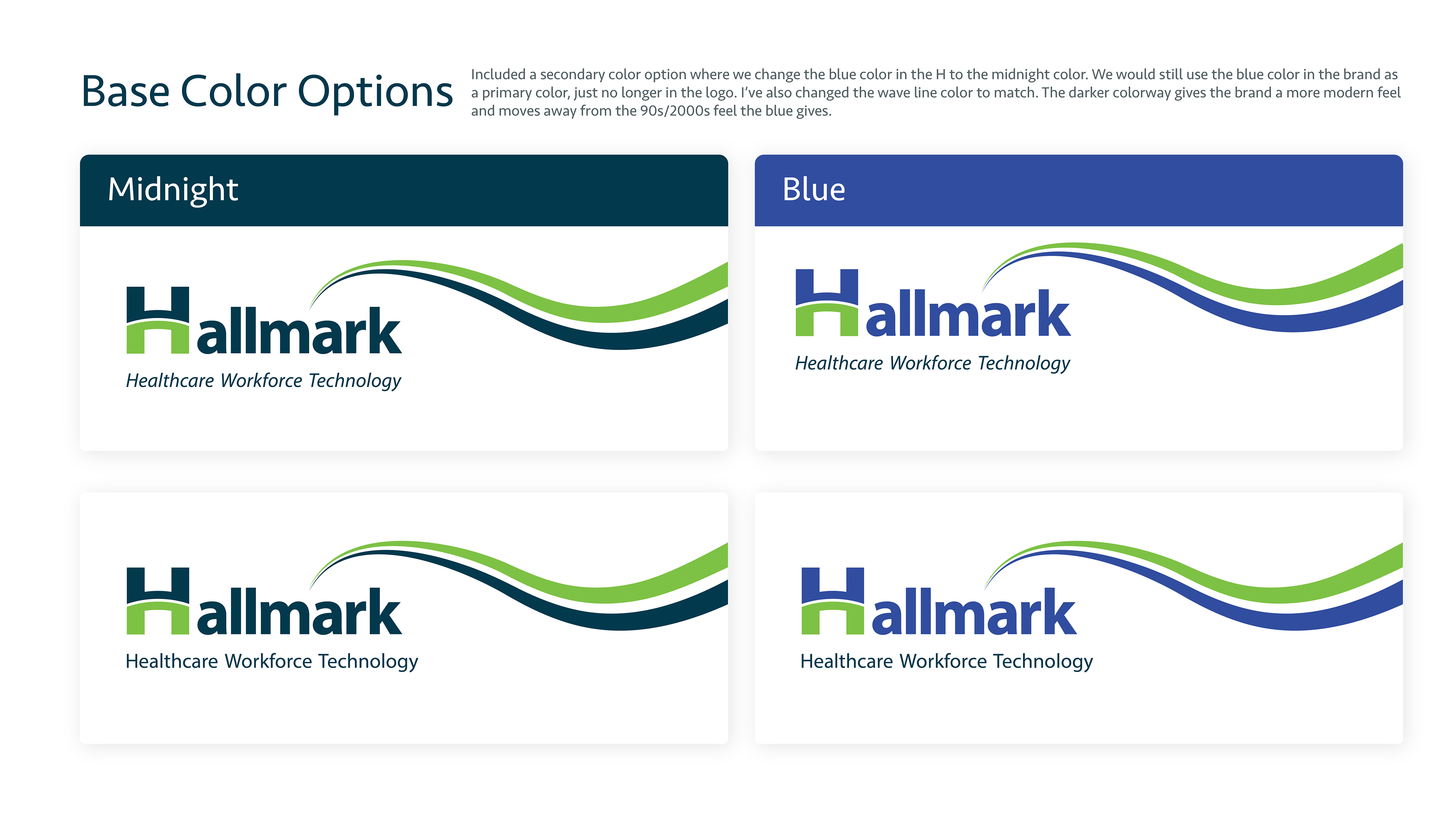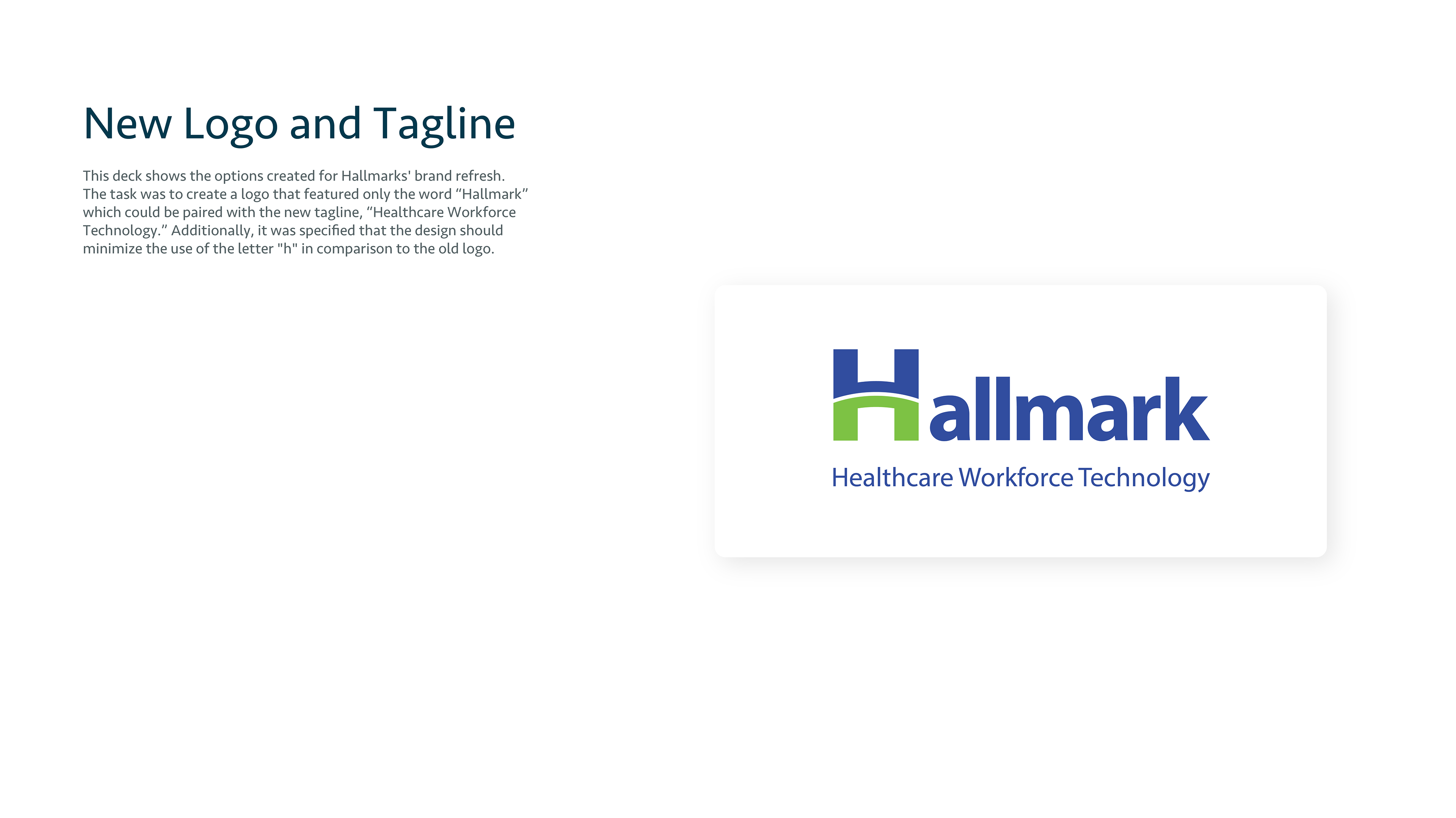 This is the pitch deck I created to present the designs I made to internal stakeholders at the company with their new brand refresh from "Hallmark Health Care Solutions" to "Hallmark Workforce Technology." I was asked to present two options I felt we're the strongest along with a handful of similar options for color, and typeface options. The first page below is the final design they decided to use.
