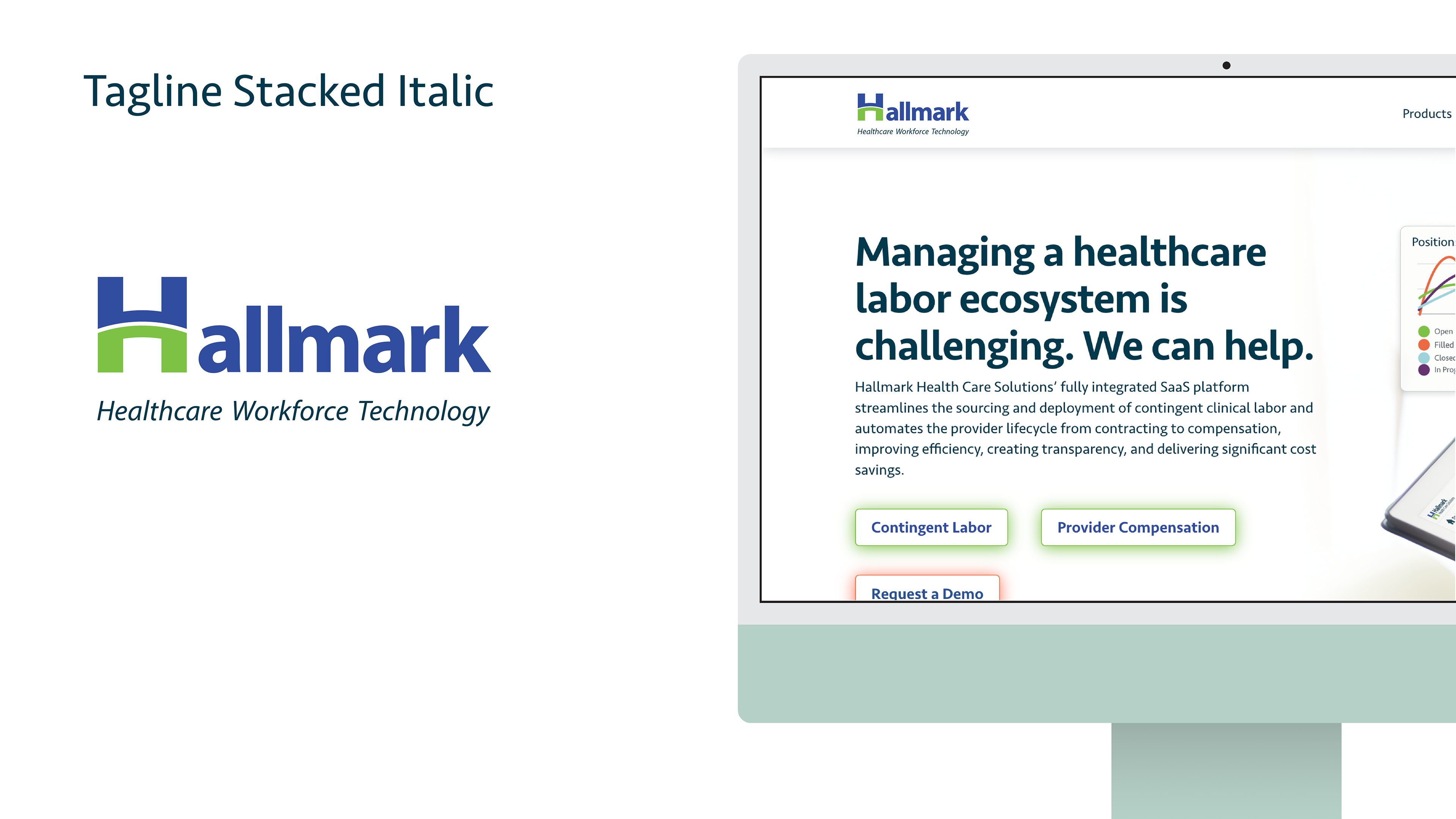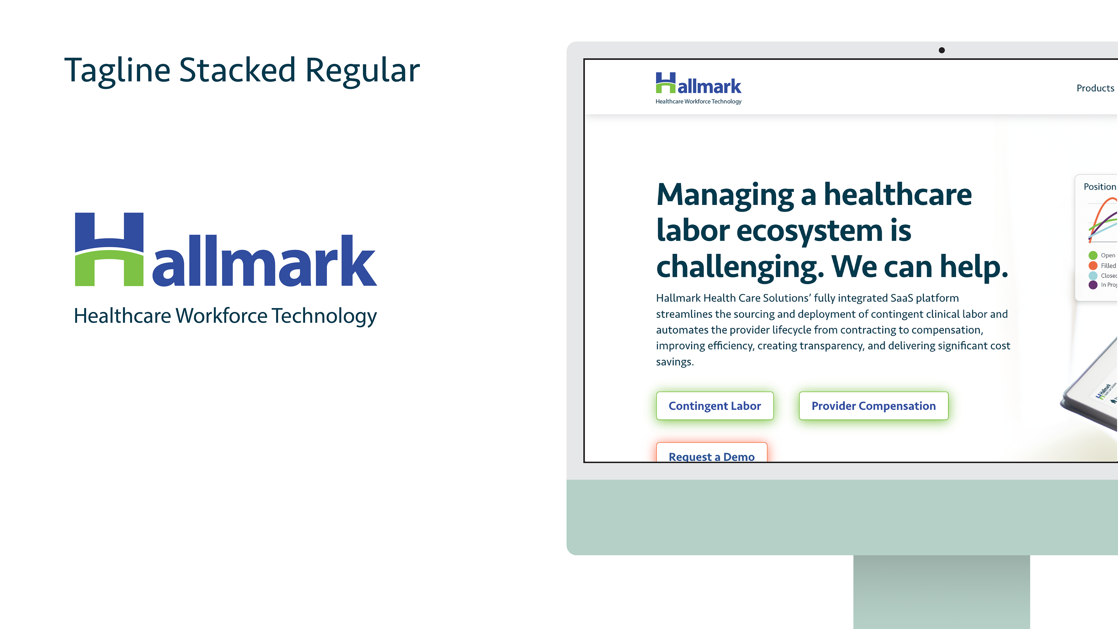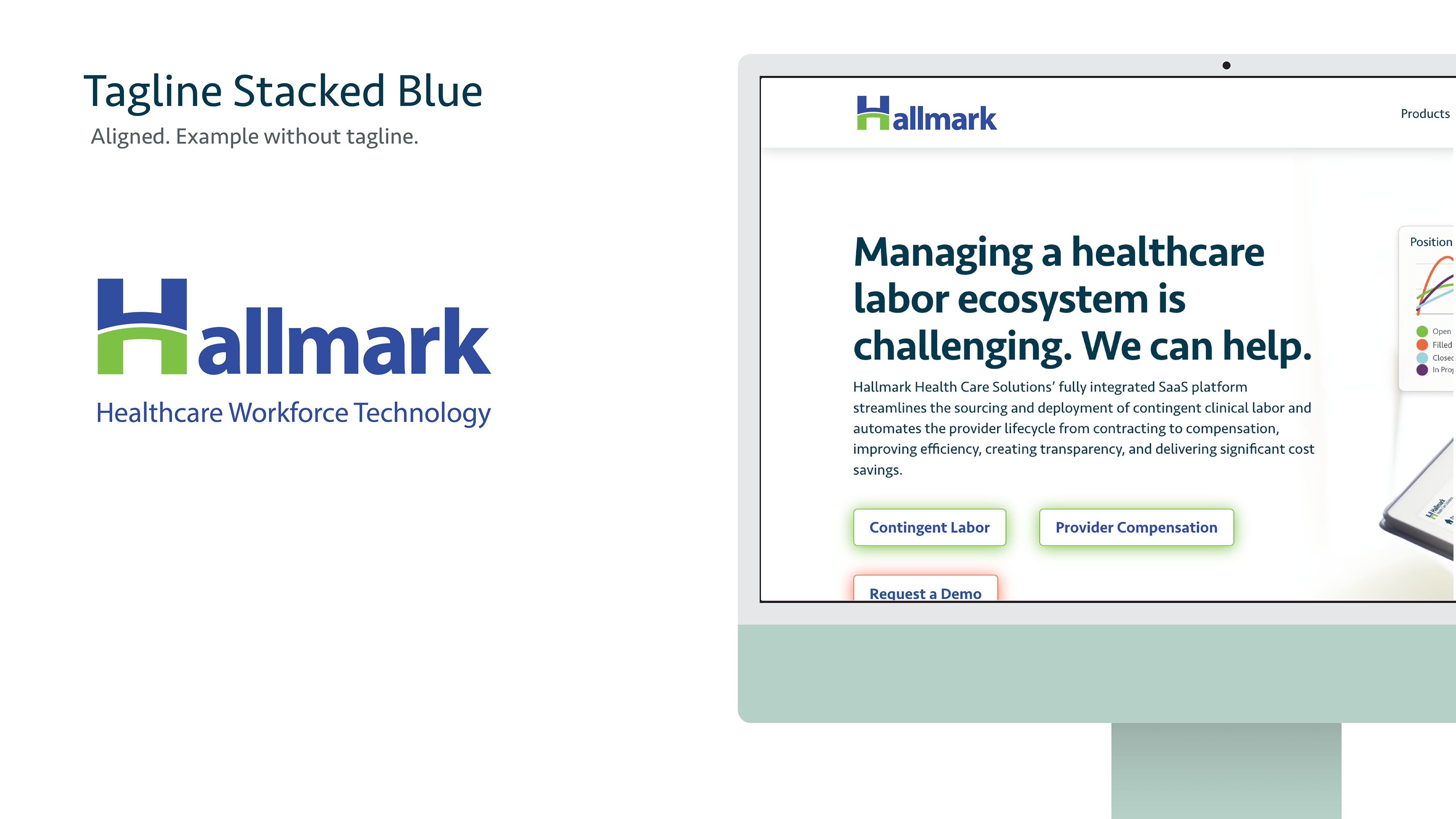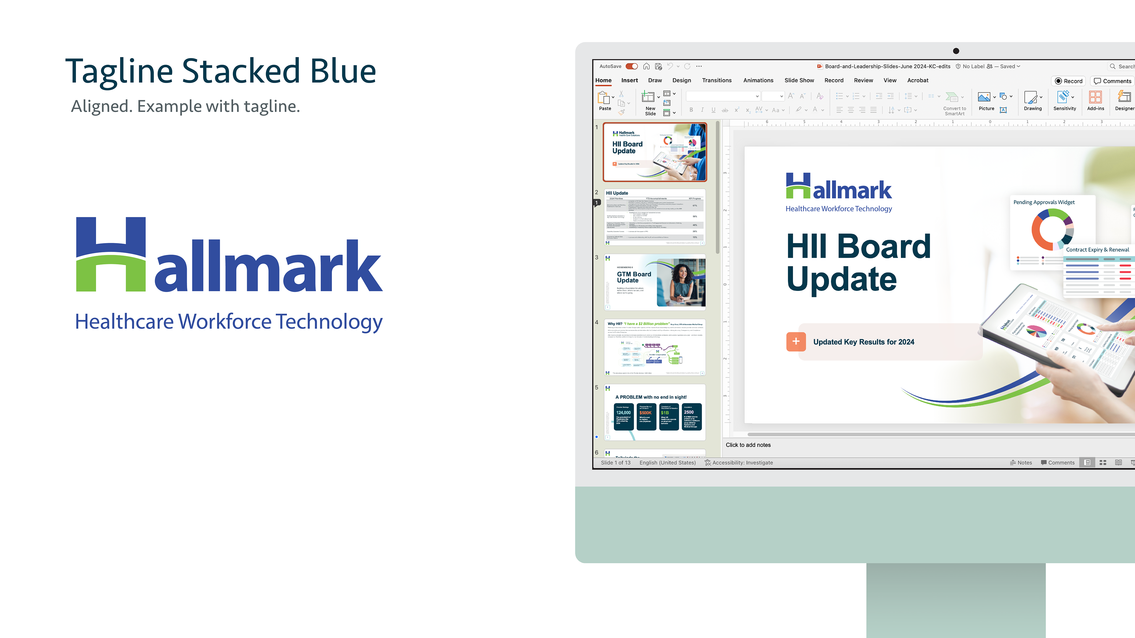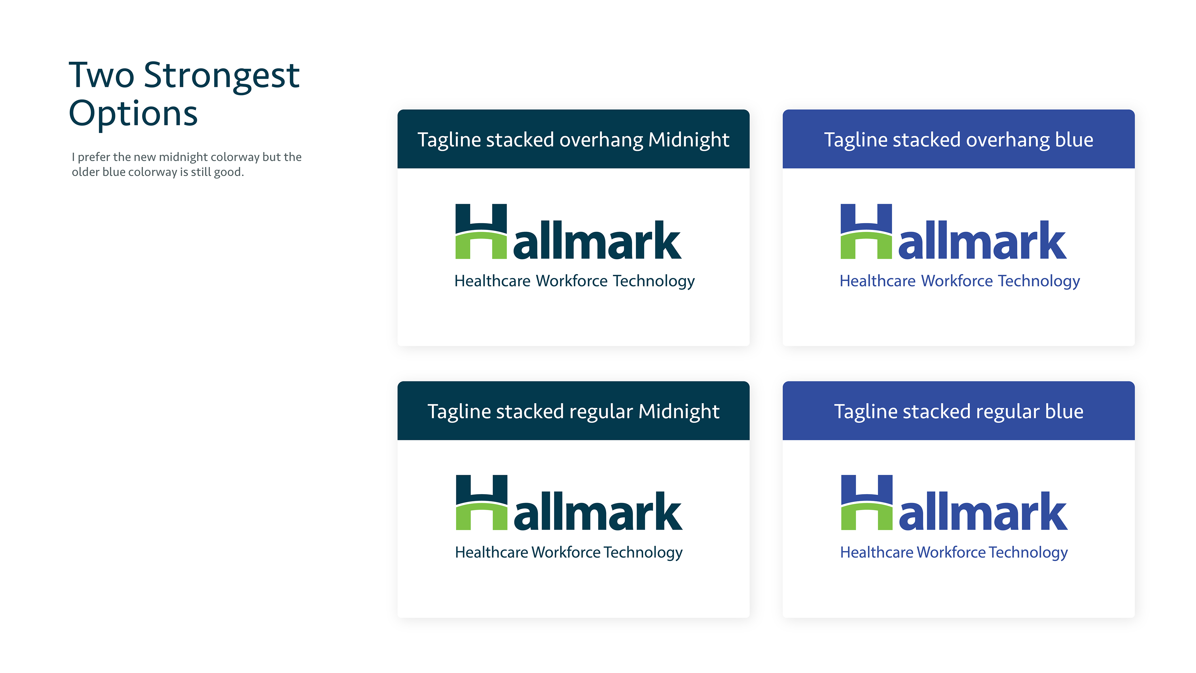This is the pitch deck I created to present the designs I made to internal stakeholders at the company with their new brand refresh from "Hallmark Health Care Solutions" to "Hallmark Workforce Technology." I was asked to present two options I felt we're the strongest along with a handful of similar options for color, and typeface options. The first page below is the final design they decided to use.